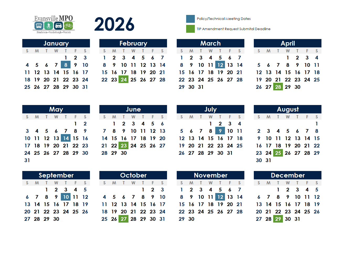 Each formal amendment period involves the submittal of new TIP projects and changes to existing projects fifteen (15) days prior to the Technical and Policy Committee meetings (Please refer to the calendar for specific dates). Public notification of the actions will be posted on the Evansville MPO website and input will be accepted during the public comment period. Once reviewed by the public, and approved by the MPO Technical and Policy Committees, the appropriate State DOT (INDOT or KYTC), FHWA, and FTA are notified of the approval. The appropriate State DOT will then process a STIP amendment according to their STIP amendment process. Following the State DOT review for inclusion in the STIP, FHWA and FTA are notified that the STIP amendment is available for federal review and approval.